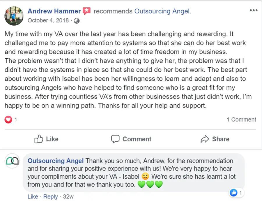 I’ve had such a wonderful experience with Outsourcing Angels. They had great procedure and systems at the beginning to understand our business and to find us candidates. We are very lucky to have found our VA Angelique. Angelique has been with us for nearly three months – she understands our business and systems. Very committed, reliable and a pleasure to work with. Cannot thank Outsourcing Angels enough for this!
